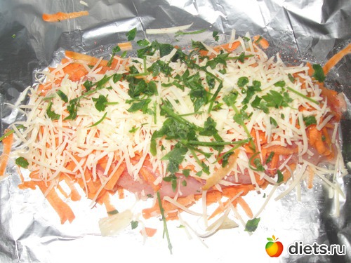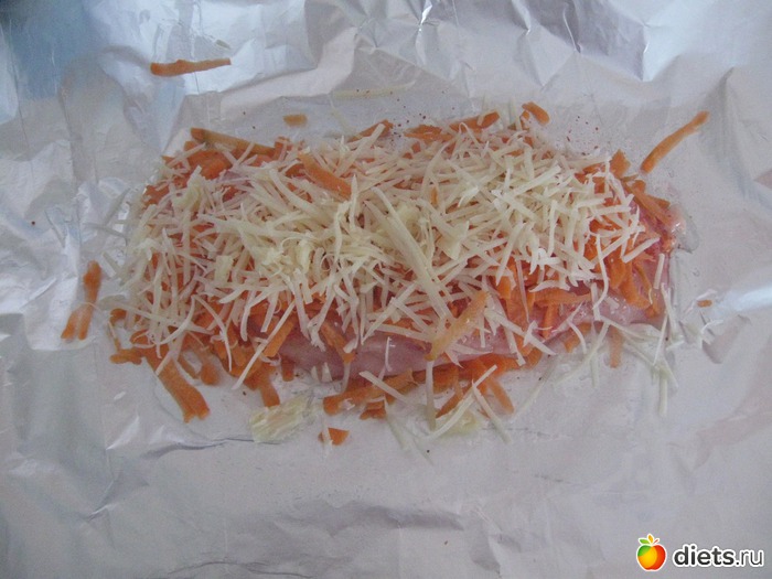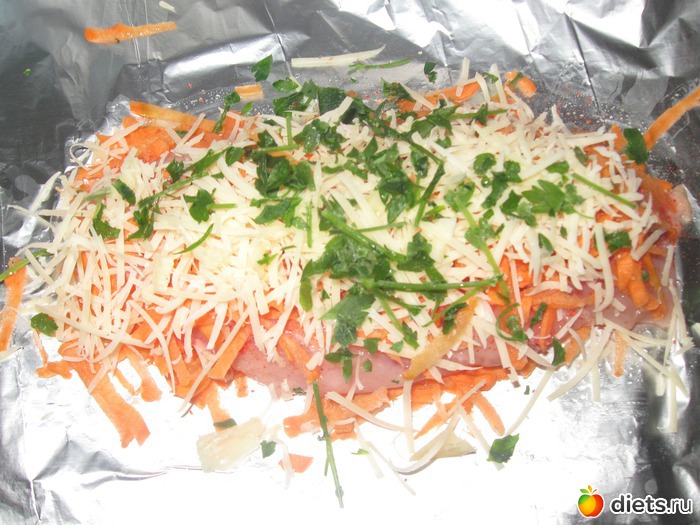 Фольгу смазала капелькой растительного масла, положила тертую морковку, на нее куриное филе, посыпала паприкой, сверху морковка, малюсенький кусочек тертого сыра и петрушка, завернула в фольгу и в АГ на 20 мин 250гр, это очень сочно и вкусно.