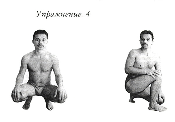 Четвёртое упражнение. Это упражнение направленно на то, чтобы воду, которая уже дошла до конца тонких кишок провести через толстую кишку. Из всех упражнений, это пожалуй самое сложное, но доступно каждому, исключение составляют люди с заболеваниями голени и мениска.