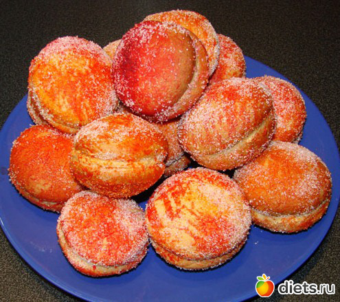 Яйца взбить с сахаром, добавить гашеную соду, затем размягченное сливочное масло, сметану и муку. Замесить крутое тесто. Разделить примерно на 20 частей, придать форму половинок персиков, выложить на смазанный жиром противень приплюснутой стороной, и выпекать при температуре 180° С минут 15 -20 (пока не зарумянятся как следует). Охладить, чайной ложкой вынуть серединки, куда потом кладу крем и помещаю 1/2 ядра грецкого ореха. Крем делаю из сгущёнки + сливочного масла. Сгущенку заранее варю прямо в жестяной запечатанной банке около 3 часов. Половинки склеиваю между собой попарно. После этого на бочках полученных «персиков» при помощи художественной кисти (или тампона, изготовленного из марли и кусочка поролона) рисую «румянец» и сразу же, пока они ещё влажные от сока, обваливаю в сахарном песке, укладываю на блюдо и ставлю на 2 — 3 часа на холод.