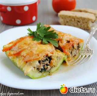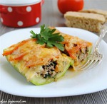 3. Лодочки наполнить фаршем, сверху уложить тонко порезанные ломтики помидора и посыпать тертым сыром, запечь в духовке при температуре 200 градусов 15-20 минут, пока кабачки не станут мягкими.