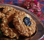Чернослив разрезать пополам и каждую половинку вдавить в середину будущего печенья.