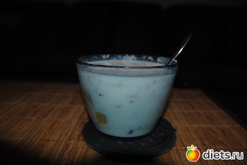 250 гр кефира + шоколадные мюсли 50 гр +киви 80гр.+2 стакана воды.