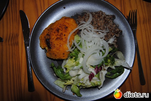 в 13.30 обед : салат 50 гр+лук, гречка 15гр, мясо индейки в кляре 150 гр (210ккал), чай зеленый 2 стакана +2 стакана воды. Люблю я воду