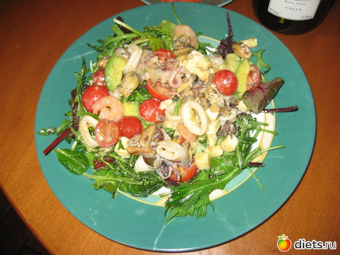 Обжарить порезанный чеснок на оливковом масле. Выложить чеснок в чашку, где будете смешивать салат. На чесночном масле обжарить с двух сторон креветки, переложить в чашку. В том же масле обжарить 1-2 мин. морепродукты (заранее их ошпарить, если были замороженные и откинуть на дуршлак, пересыпав специями для рыбы и морепродуктов). Сыр порезать кубиками, помидорки черри пополам, авокадо каждую половинку пополам вдоль и тонкими пластинками. Все, кроме рукколы смешать, заправить (оливковое масло, лимонный сок, соевый соус). Можно добавить кедровых орешков. Рукколу разложить по тарелкам и полить маслом, только перед подачей. Сверху все остальное. Можно посыпать тертым пармезаном.