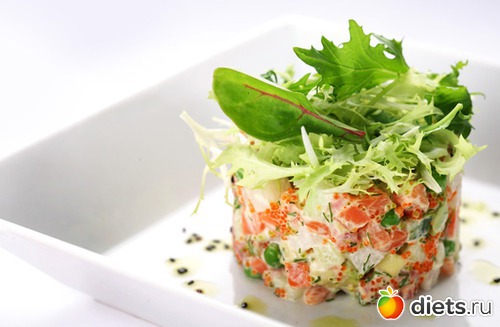В салате из крабовых палочек собственно палочки (которые на самом деле не имеют никакого отношения к крабам) лучше заменить креветками или морским коктейлем, а в заправке смешать нежирный натуральный йогурт и майонез в пропорции 2:1.