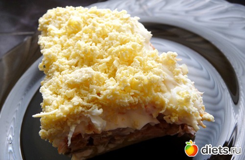 Ностальгический привет из времен, когда хорошие рыбные консервы были в дефиците. Для «Мимозы» лучше использовать отварную рыбу или консервированную в собственном соку, низкожирный сыр (до 17%), майонез пополам с обезжиренным йогуртом, а куриные яйца заменить перепелиными.