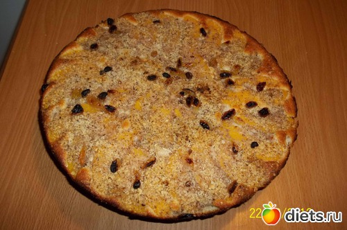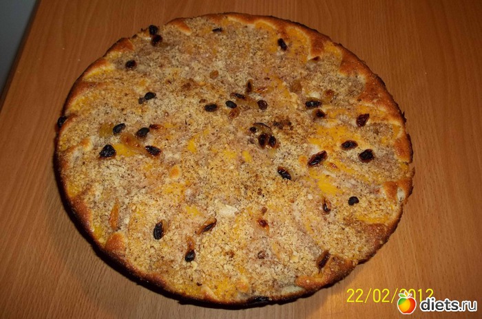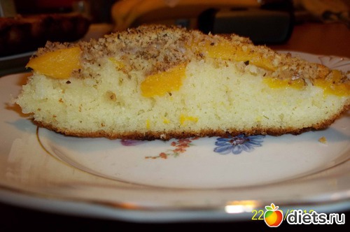200 грамм масла взбить с 200 г сахара (я брала 150, не люблю сладко когда), добавляем 4 яйца, цебру и сок 1 лимона, 2 ст.л. вина. Добавляем 200 г муки с 2 ч.л. разрыхлителя. Тесто получается, как для олидиев. Форму выстилаем промасленной бумагой, выкладываем тесто, на него персики консервированные дольками, сверху измельченый грецкий орех и еще изюм.(но он у меня почему-то подгорел и пришлось его весь убраьб с кекса