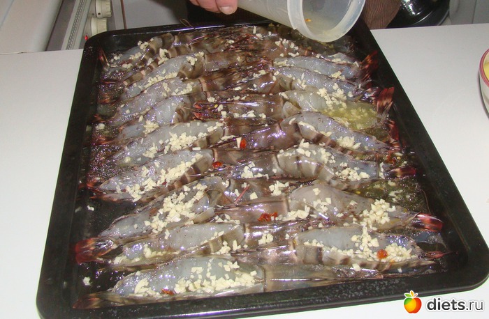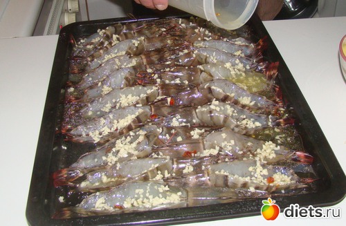 Мелко нарезанный чеснок равномерно выкладываем на подготовленные креветки