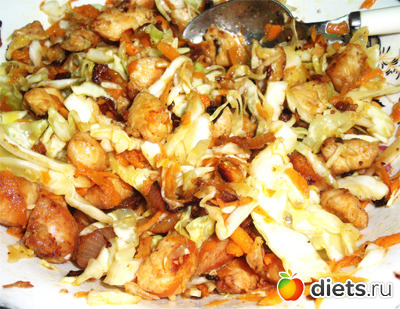 2. Шинкуем капусту и морковку и туда прибавляем мясо со всем соком и маслом, которое образовалось при жарке. Прямо так горячим. Перемешиваем мясо с капустой.