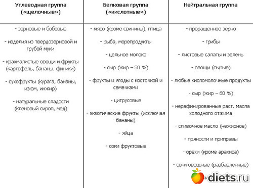 Согласно этому принципу, продукты белковой группы не должны сочетаться с продуктами углеводной группы (см. таблицу). Также нельзя есть вместе углеводы и кислые фрукты – кислоты нейтрализуют щелочную среду, необходимую для расщепления углеводов.