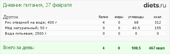 Меню: 250г риса отварить, разделить на 6 порций, есть в течении дня, 2,5л воды, 3 ч. л. меда отдельно от риса.