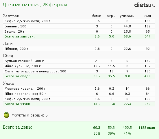 вот такой рацион у меня получился, пусть немного отклонился от диеты, но белка всё равно было много)))