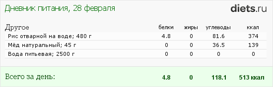 Третий и последний рисовый день диеты. За первые два дня ушло 1,7 кг, я понимаю, что это вода и не питаю иллюзий, настрой боевой ). Единственное, что с кишечником как то неочень, простите за подробности, сегодня постараюсь пить побольше воды, может, скорее все выйдет, а то третий день уже все копится - не приятно, думаю, что всетаки от маленьких объемов поступаемой пищи, очень надеюсь на изменение ситуации )
