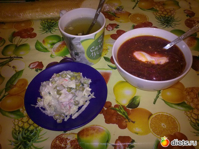 Ужин: салатик из отварной свеклы и чернослива, заправленный сметанкой. Кусочек запеканочки творожной и кефир.