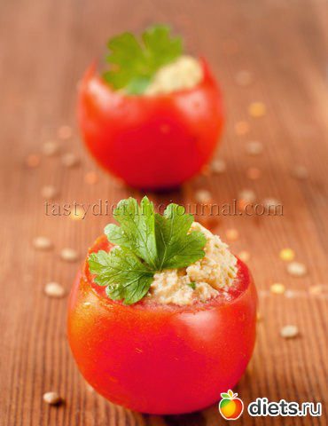 Собственно, чечевицу сварить, как указано на упаковке (я в мультиварку – чечевицу и воду в соотношении 1:2 и на «гречку»). В блендере взбить вместе с зеленью, чесноком и маслом, любителям острого можно еще лимонный сок добавить, а также карри или куркуму, например, и запихнуть в очищенные внутри помидоры.