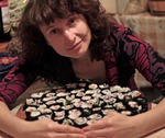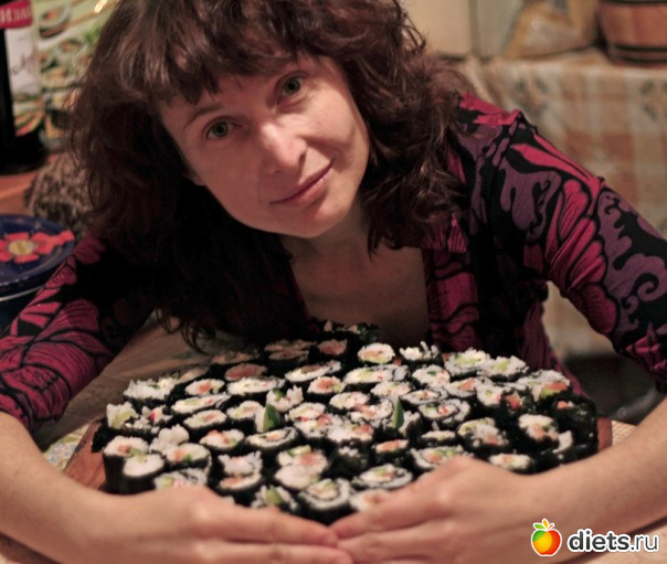Готовим, как обычно, на лист нори выкладываем слой риса, на него начинку из творога и овощей, заворачиваем ролл и режем.