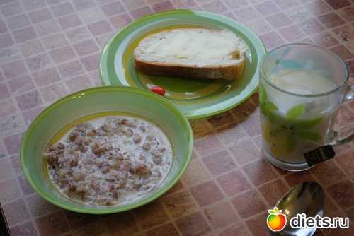 С утра на меня напала какая-то веселуха, так что я не расстроилась. Решила позавтракать кашкой из хлопьев краснозернового риса на молоке, тостом с маслом и зеленым чаем с молоком. Кашка удалась, а вот тост нет. Сломался тостер,