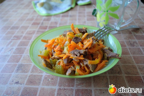 Параллельно с борщом у меня получилось приготовить еще салатик из отварного мяса, припущенной моркови с луком и солеными огурчиками. Салатик был на обед
