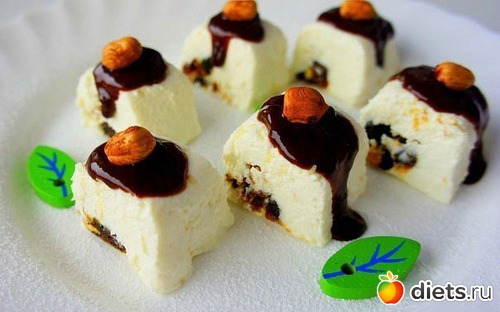 11. Присыпьте творожный десерт сахарной пудрой, полейте растопленным шоколадом и украсьте фундуком.