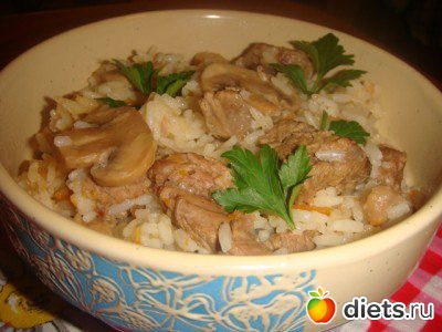 Репчатый лук измельчаем, грибы нарезам тонкими ломтиками, морковь соломкой, порей кольцами. Говядину нарезаем небольшими кусочками, обжариваем в разогретом масле до коричневой корочки 6 минут. Добавляем овощи и грибы, гоовим еще 7 минут. Добавляем промытый рис, вливаем 800 мл. воды. Тушим на медленном огне под крышкой 20 минут. Затем вливаем вино, солим, перчим и тушим еще 5 минут.