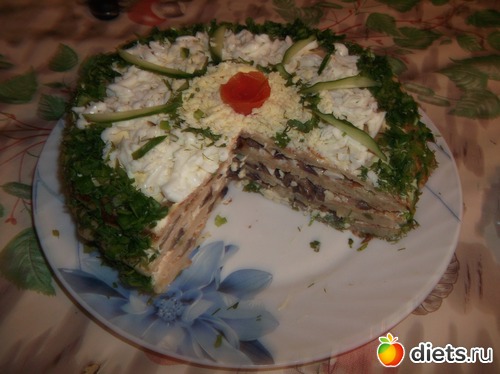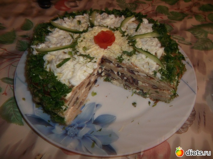 блин по сковороде и выпекаем блин на небольшом огне. Когда блин испечётся с обеих сторон, выкладываем его на тарелку, смазываем кремом, берём ст. ложку начинки, выкладываем на крем, тем временем испёкся второй блин, прямо из сковороды укладываем его на начинку, и т. д.