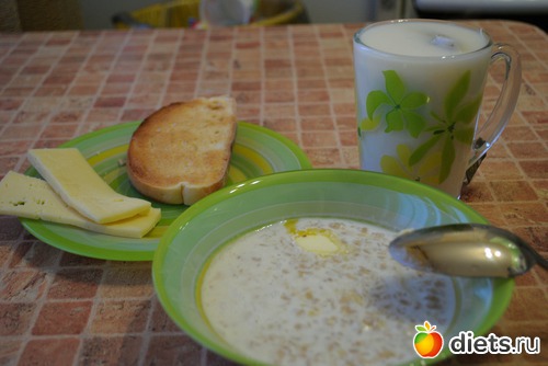 На обед у меня был тост с сыром, каша из хлопьев и зеленый чай с молоком.