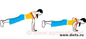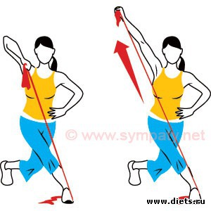 Возьмите один конец ленты в правую руку, другой конец прижмите правой ступней. Левую ногу поставьте сзади правой на некотором расстоянии. Представьте себя балериной или придворной дамой и сделайте книксен (то есть полуприсед). Поднимите правый локоть по диагонали, кисть при этом находится перед вашим плечом. Ваша рука до локтя и лента должны составлять единую прямую линию. Это исходное положение. Распрямляя руку, поднимите вверх только кисть. Задержитесь в таком положении, затем медленно опустите кисть в исходное положение. 10-12 повторений.