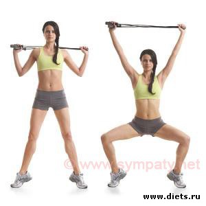 Поставьте ноги немного шире, чем на ширину плеч, носки смотрят в противоположные стороны. Встаньте на носки. Ленту держите обеими руками на плечах, как если бы это была штанга. Это исходное положение. Сделайте плие, при этом колени смотрят в противоположные стороны, а пятки не касаются пола. Одновременно поднимите вытянутые руки над головой. Задержитесь в таком положении, затем выпрямите ноги и опустите руки и вернитесь в исходное. Начинающим – 20-25 повторений, продвинутым – до 50 повторений.