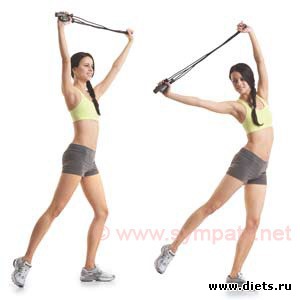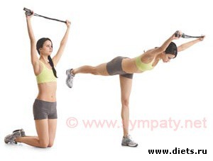 Стоя слегка согните колено левой ноги, правую ногу отставьте назад и вытяните. Поставьте правую ногу на носок. Ленту или эспандер возьмите обеими руками и поднимите над головой. Это исходное положение. Медленно приподнимите правую ногу над полом на 10-15 см. Поверните туловище вправо. Вернитесь в исходное положение. В каждую сторону сделайте до 20 до 40 повторений.
