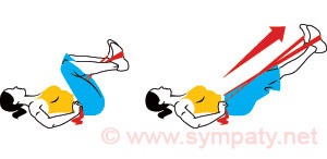 Лягте на пол на спину, ноги согните в коленях под углом 90 градусов. Накиньте на ступни петлю из ленты, скрестите ленту буквой Х и пропустите между ног. Держите концы ленты в руках у бедер. Это исходное положение. Напрягите корпус и медленно вытяните ноги. Теперь они должны быть под углом 45 градусов к полу. Задержитесь в таком положении, затем вернитесь в исходное. 10-12 повторений.