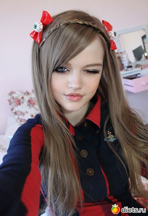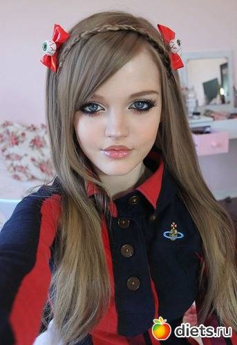 Если при помощи фотошопа убрать лишнюю штукатурку, получим обыкновенную симпатичную девочку со слегка кукольным лицом