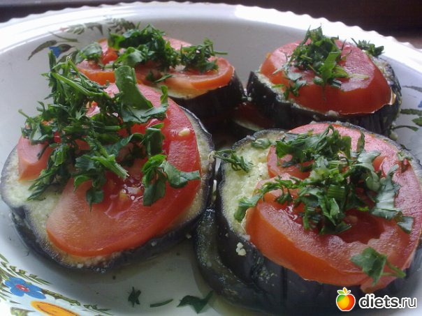 на сухой сковороде с добавлением водички потушить баклажаны с двух сторон и затем помидорки. выложить пирамидки чередуя баклажан с помидорой и свеху зелень.