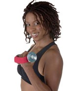 Упражнение 6. Теперь встаньте и возьмите в руки гантели. Поднимите вверх. Пальцы рук касаются друг друга. Согните руки так, чтобы гантели оказались за спиной. На вдохе выпрямляем руки, на выдохе сгибаем. Повторите 15 – 20 раз.