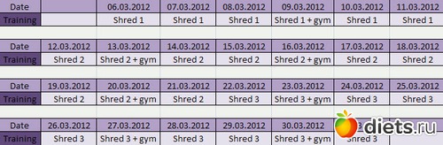 Кроме шредов и тренировок в зале будут приседания по утрам по программе "200"; как обещает разработчик программы, через 6 недель я смогу делать 200 приседаний. Ну посмотрим...