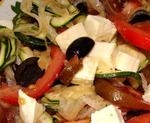 на той же терке режем лук тонкими кольцами, добавляем к цуккини,