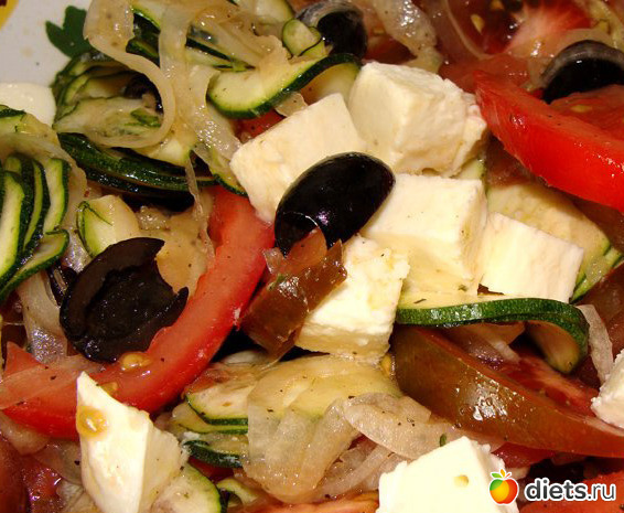 Моцареллу нарезаем кубиками, посыпаем салат сверху.
