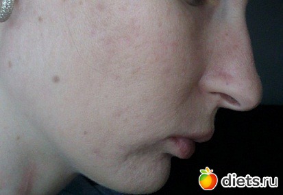 на лице пудра выглядит так, нанесение - кистью. маскировка слабая, красноту и пятна видно (пудра нанесена на голую кожу, без крема, лосьона и пр., никаких тональных, корректоров тоже нет)