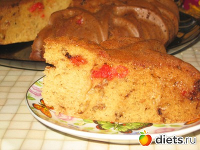За счет уменьшения количества сахара и замены части масла яблочным пюре этот кекс получается гораздо менее калорийным и более полезным, чем его собратья, приготовленные на маргарине. Калорийность готового кекса около 280 ккал на 100 грамм.