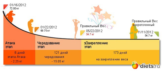 За атаку -почти 8 кг!!!!!!!! Молодчина!!!! А у меня ушло только 1.5 кг за 5 дней!!! Но сейчас уже четвертая неделя и.... 1кг в неделю меня тоже устраивает. хорошая диета. Мне нравится.