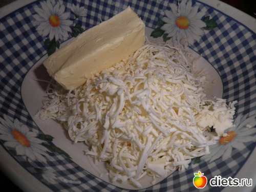 Для начинки: Сырки, яйца потереть на мелкой терке, к ним добавить мягкое сливочное масло