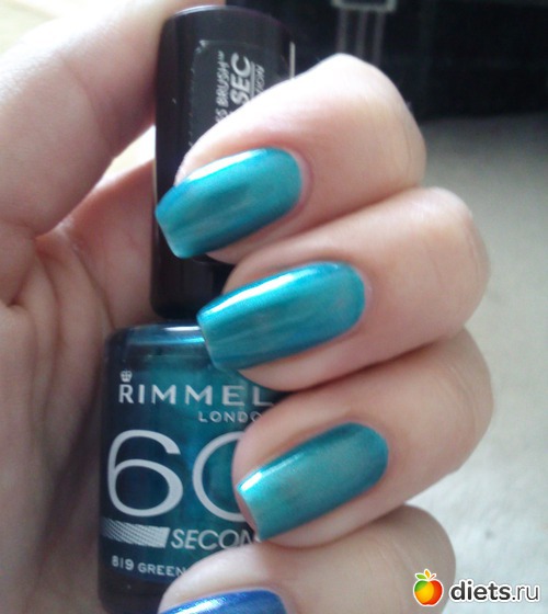 2) Rimmel №819 Green with envy. Лак цвета морской волны. Не могу его носить на себе, т. к. чувствую себя кикиморой болотной с таким цветом. Помимо этого при случайном мимолетном взгляде на ногти создается впечатление, что они намазы зеленкой! Я прекрасно понимаю, что это сугубо мои тараканы в голове и лак красив, но... не для меня он видимо...
