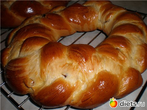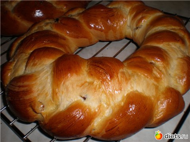 Дальше эти рулетики переплетаем между собой косичкой. И выкладываем на смазанный противень в форме веночка. Пока подогреется духовка (10мин) пусть калачик постоит снова в теплом месте и еще немного подойдет.