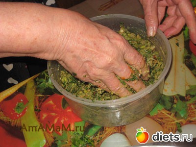 Добавить к фасоли мелко нарезанные зелень, лук и чеснок и измельченые грецкие орехи. Смешать, консистенция лобио должна напоминать паштет, быть вязкой, эластичной и густой. Если наш орехово-фасолевый салат оказался суховатым и распадающимся на отдельные кусочки, долить немного фасолевого отвара и снова перемешать.