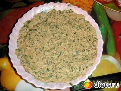 Слева вверху - это измельченные почти в пыль грецкие орехи, основа салата лобио, которая впитывает в себя все эго остро-пряные соки и соединяет это вкусное блюдо.
