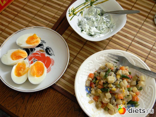 2. Варишь 3 яйца, 2 желтка отдаешь в салат с зел луком для папы, сама ешь 1 яйцо + 2 белка. в 100гр белка 11гр белка, 44 калории и все. Ничего больше