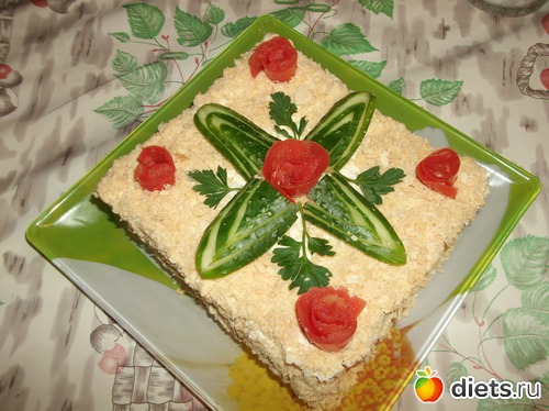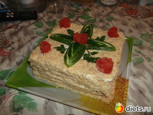 получалось оооочень калорийно...Оказывается можно заменить нежирным йогуртом! Ещё один слой был из грибов....я ,думаю, грибы можно оставить!
