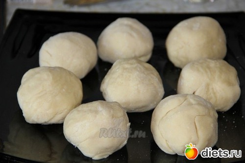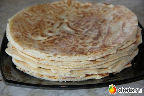 Раскатываем один кусочек диаметром больше сковороды и выкладываем на разогретую сковородку.