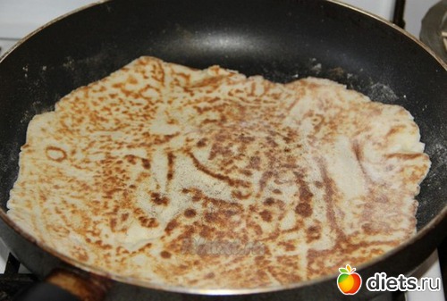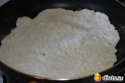 Через минуту переворачиваем (коржи жарятся очень быстро).