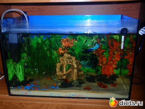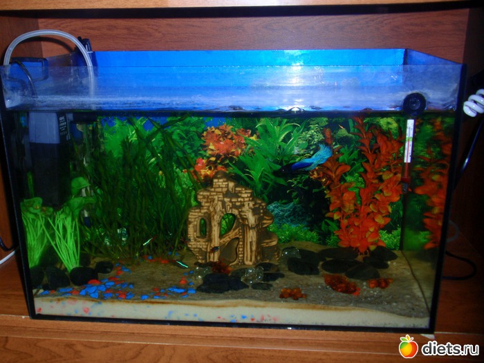 Кстати, про аквариум. В нем сейчас живут уже 5 неончиков, 4 гупешки, петух мальчик и девочка, 2 сомика. Последнее приобретение - это как раз гупешки и петух девочка. Так вот, плавает значит у нас мальчик, я его и так и так пугала, не хочет он распушать свои плавники около головы ( на работе у девчонок, точно такой петух при любом стуке по аквариуму, начинает его распускать и показывать какой он страшный), я уже стала думать, что все-таки наши петушки различаются и у моего такого плавника просто нет. Так вот, стоило мне запустить в аквариум девочку, как этот плавничок появился