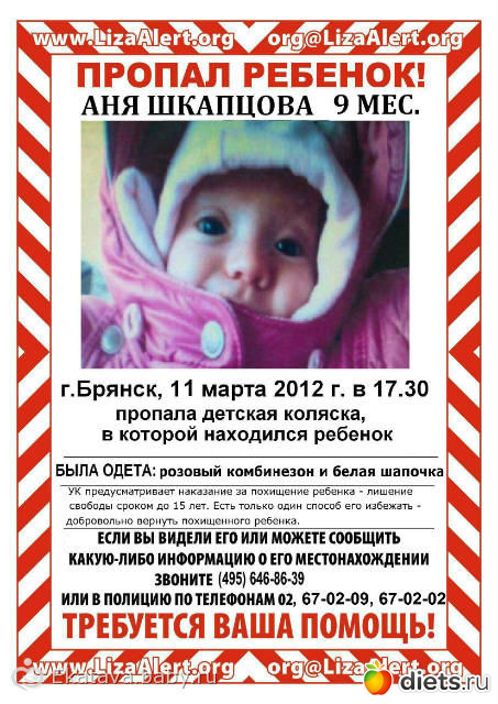11 марта 2012 года в Брянске пропала коляска с 9-месячной Аней. Ребенка ищет полиция, но пока не достигла никаких успехов, поэтому ОЧЕНЬ нужна помощь волонтеров.